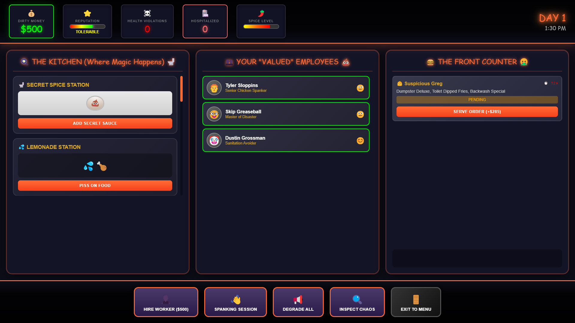 You're the morally bankrupt owner of the world's most questionable fast food joint. Goal: $1,000,000 in 365 days by any means necessary.