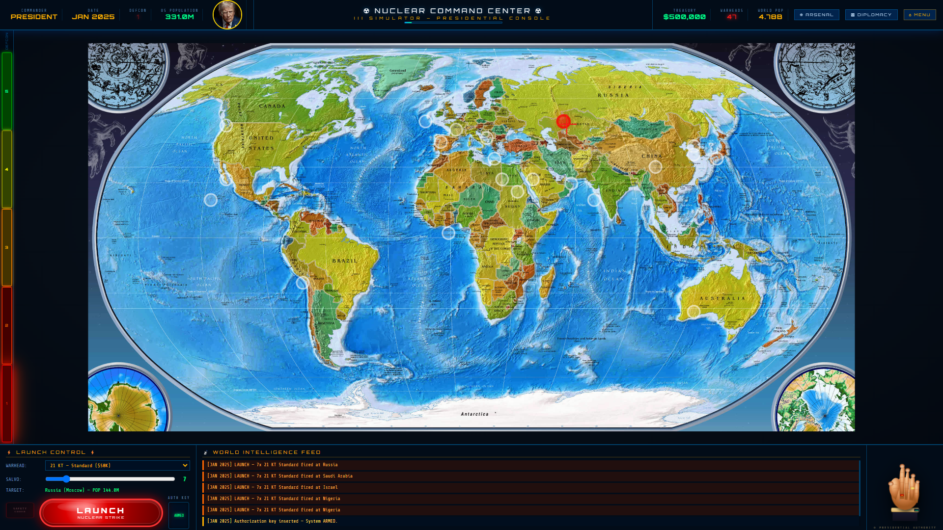 Nuclear Command III is an intense strategic nuclear warfare simulator where you command the United States' nuclear arsenal in a global conflict. Navigate complex diplomacy, manage limited resources, and make life-or-death decisions as the world teeters on the brink of annihilation.